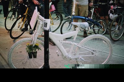 Los Ghost Bikes son pequeños monumentos conmemorativos, que marcan el lugar donde algún ciclista ha muerto. Los puede hacer cualquiera, con bicicletas de deshecho pintadas de color blanco y candadas cerca del sitio del accidente, se acompañan de una pequeña placa donde se indican los datos del accidente.