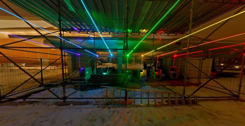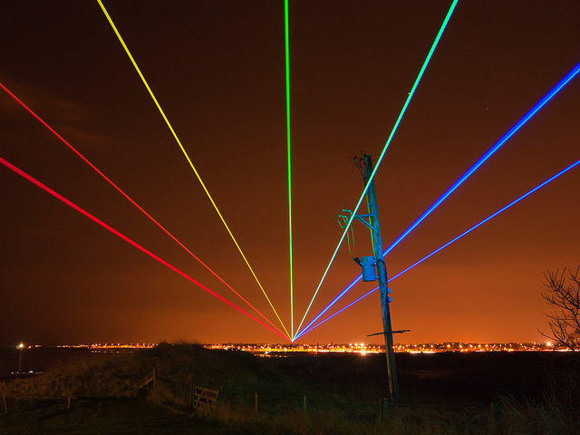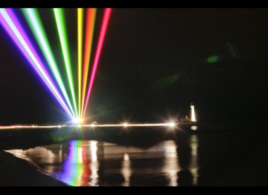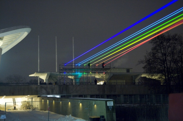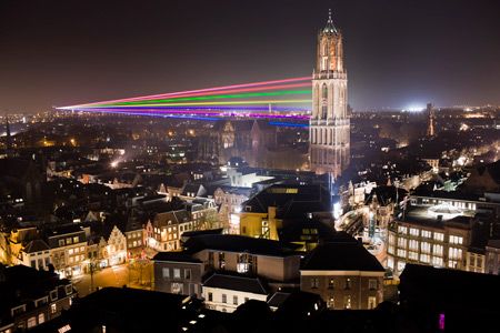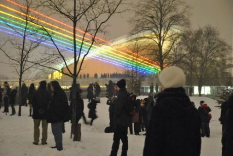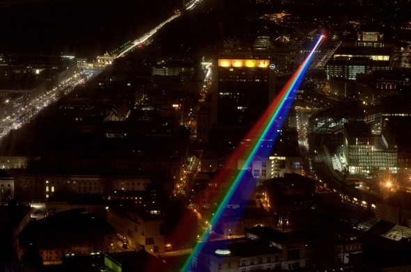 Esta artista crea, mediante 7 potentísimos rayos láser que dibujan un arcoíris de 8 kms, normalmente proyectado sobre ciudades altamente pobladas.