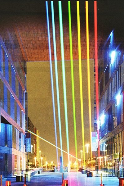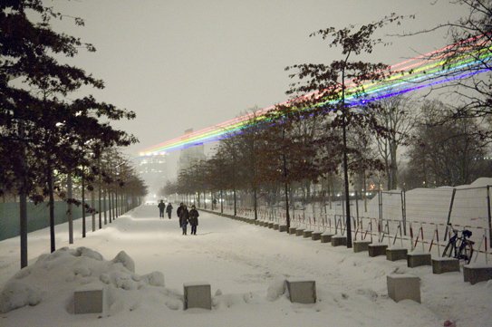 Global Rainbow que así se llama la instalación, fue creado inicialmente para la ciudad de Nueva York donde se proyectó desde un rascacielos de Wall Street en el centro de Manhattan y se extendía desde el puente de Brooklyn, al este y el río Hudson al oeste, pasando por encima de la Zona Cero.