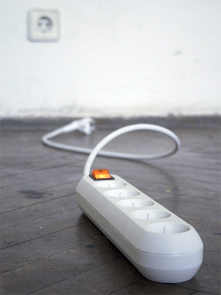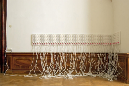Enchufes, interruptores, tubos fluorescentes, bombillas y cables juntos y en grandes cantidades son los elementos preferidos de este artista que tiene trabajos muy visuales, aunque no demasiado novedosos.