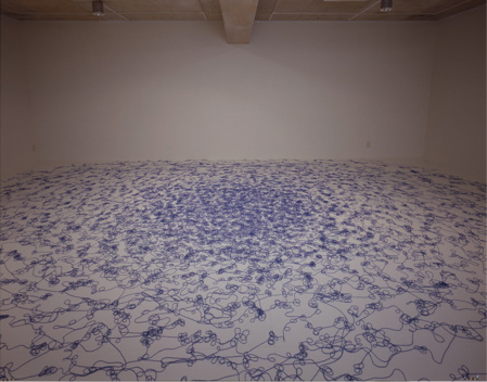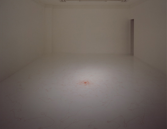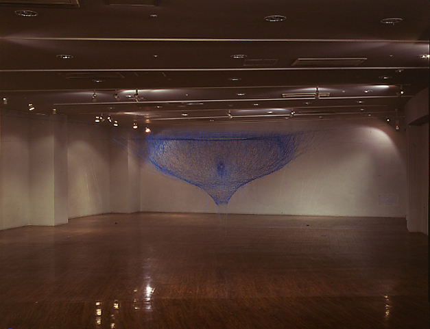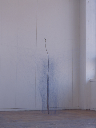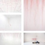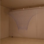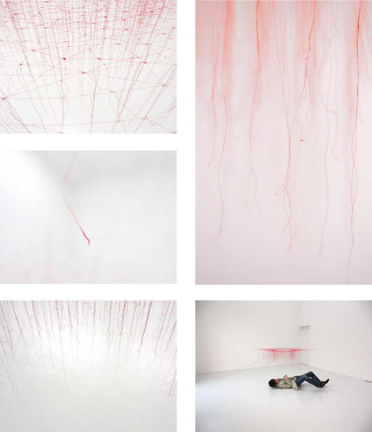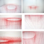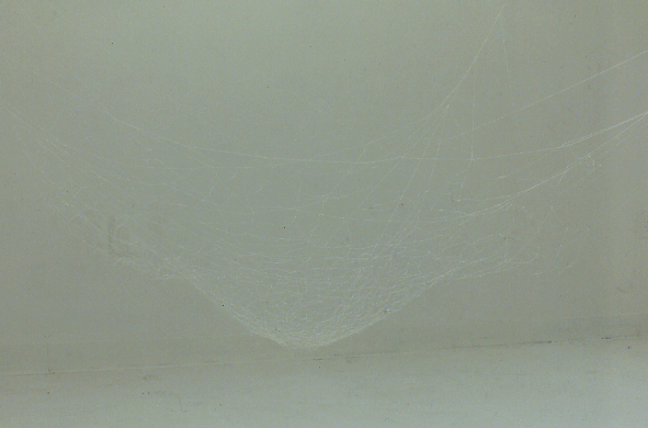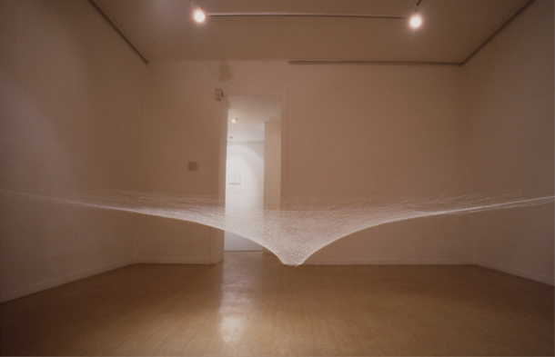 Son trabajos hechos con finos hilos de seda, la mayoría de las veces de color blanco, que flotan en el aire componiendo figuras que parecen estar a punto de desaparecer en el espacio.