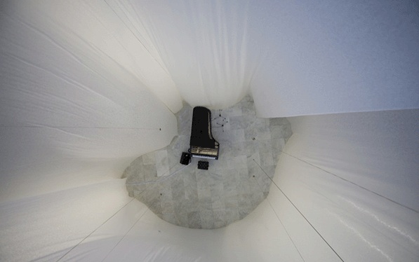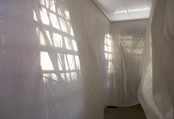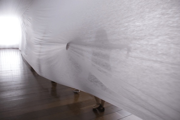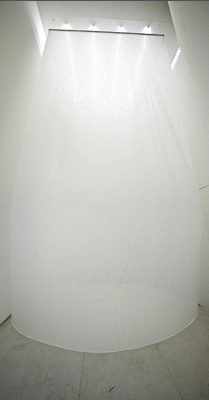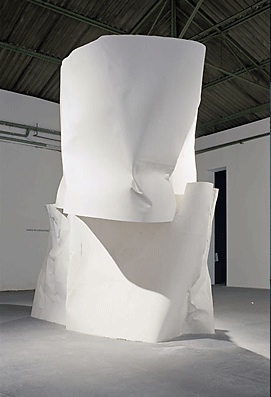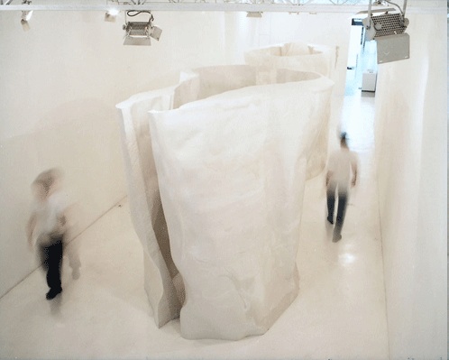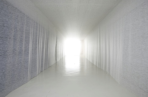 Lejos de ser una Tara Donovan, él utiliza materiales blanco de extensión infinita, sin apenas cortes ni pliegues, superficies extensas que dotan el espacio de una simplicidad que te transporta a un lugar atemporal y misterioso de inmensa profundidad.