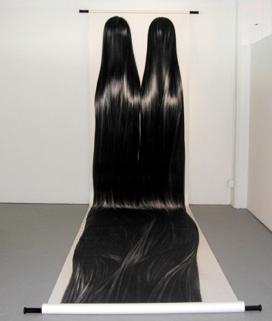 La serie de la que estoy hablando se llama Twin Spirits y en ella la artista retrata las largas cabelleras de su hermana gemela y de ella misma, exagerando en tamaño y largura una característica de ambas, en lo que según dice la artista, es una metáfora para mostrar algo que está más allá del propio cabello.