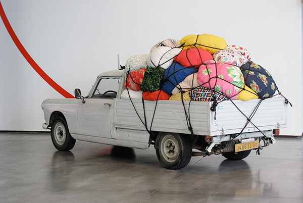 Señas de identidad de su trabajo, son sobre todo, el uso de tejidos tradicionales, que ella cose a mano, especialmente colchas de vivos colores, tambien trata con una visión artística, el concepto de nómada.