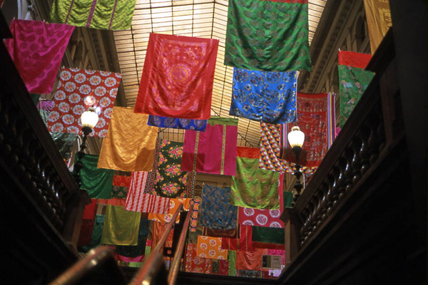 Además, una película de difracción translúcida, cubría la estructura acristalada del palacio, por lo que la luz procedente del exterior, al reflejarse en el vidrio, creaba efectos de arco iris por todo el espacio, amplificado por el uso del gran espejo.