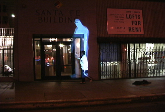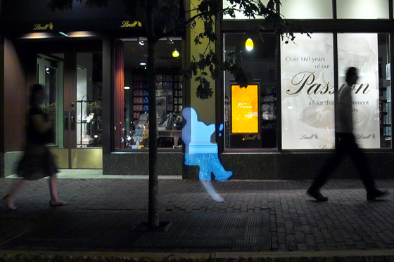 Un vehículo que circula lentamente por la ciudad proyecta mediante un sistema de software interactivo, la silueta de un personaje virtual y animado sobre el paisaje urbano, mezclándose con la arquitectura y los transeúntes. La silueta, en movimiento, avanza según se mueve el vehículo, y el comportamiento del personaje se ve influida por el contexto urbano y los transeúntes, el movimiento del coche a través de la ciudad determina las actuaciones del personaje virtual y sus patrones de movimiento.